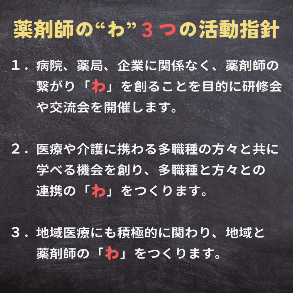 薬剤師の“わ”では、知識やスキルの学びだけではなく、多くの薬剤師や医療に携わる多職種の方々、そして地域の方々との繋がり「わ」を通じて、薬剤師一人ひとりの「わ」をつくることを目的に活動していくことを、このロゴに込めています。