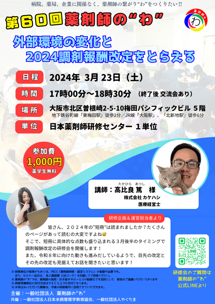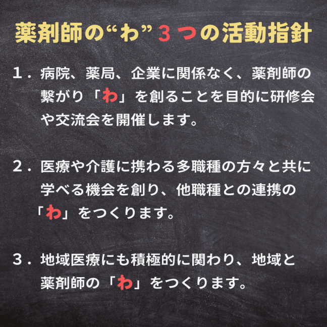薬剤師の“わ”は、病院、薬局、企業に関係なく、薬剤師の繋がり「わ」を創りたいとの思いから、研修会や交流会を定期的に開催しています❗️