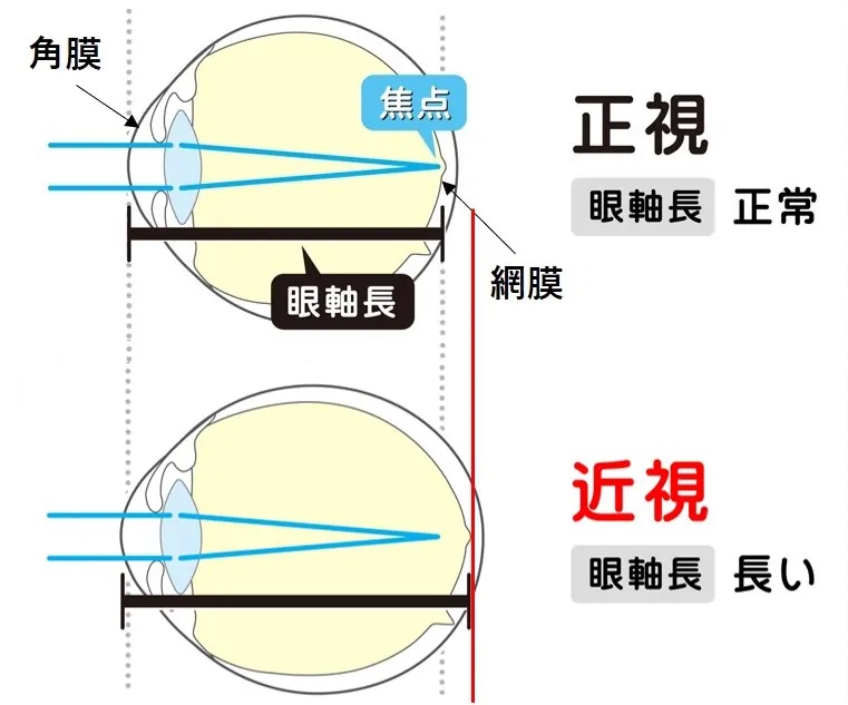 近視は眼軸長が長くなって、目の中に入った光線のピントが合う位置が網膜より前にある状態です。