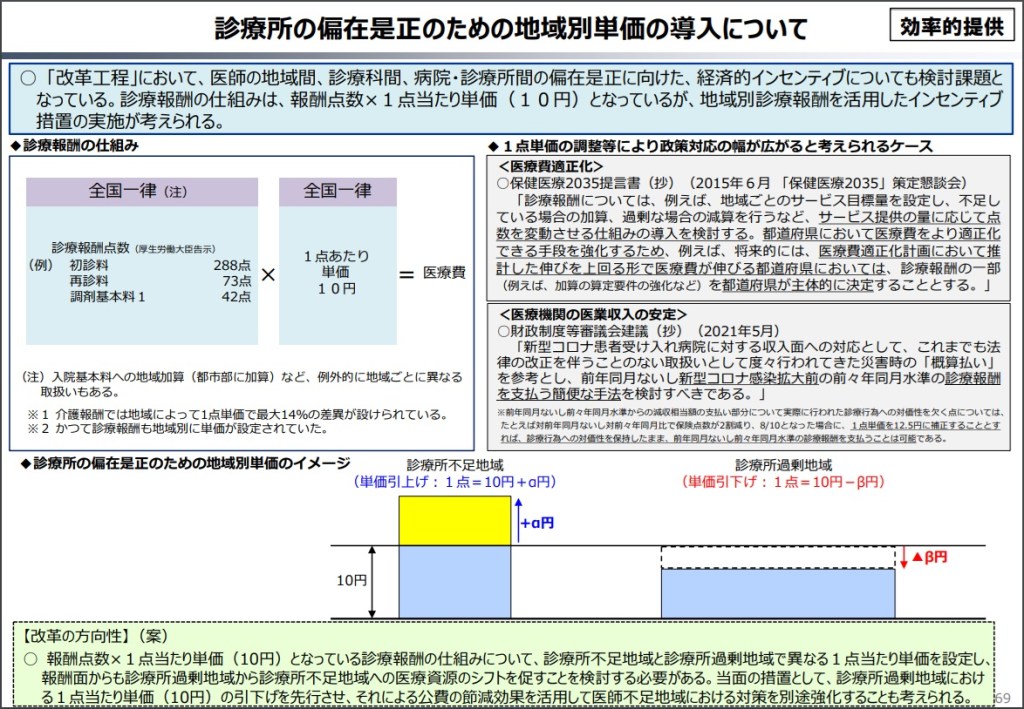 診療所過剰地域から診療所不足地域へ医療資源のシフトを促すために、地域別の報酬単価の導入を検討するということです。