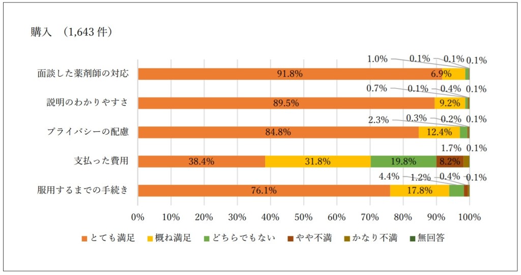 購入して服用した人に対して服用直後に依頼したアンケート結果では、「薬剤師の対応」、「説明」、「プライバシー配慮」については、満足度が高い結果となっています。