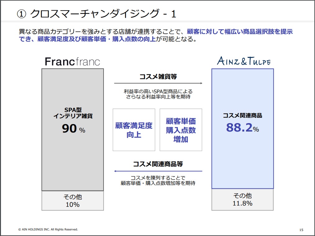 それにより、アインズ&トルぺに来たお客はFranc francの商品も購入することができ、顧客満足度や顧客単価の向上が見込まれるとのことです。