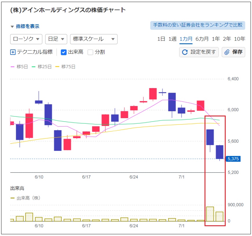 そして、7月5日も値を下げて、終値が前日比-178円安の5,375円と2日続落