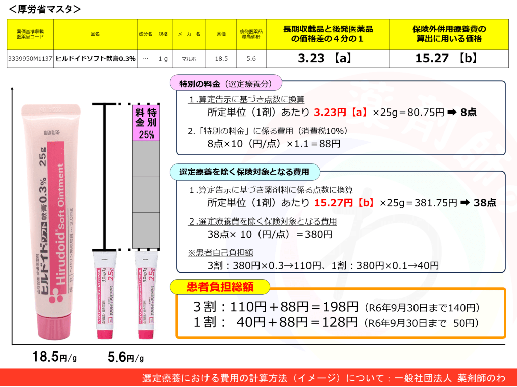 1割負担や3割負担の患者さんであれば、選定療養の対象になり、先発医薬品と後発医薬品の差額の25%が保険給付から外れ、自己負担が発生することは理解できます。