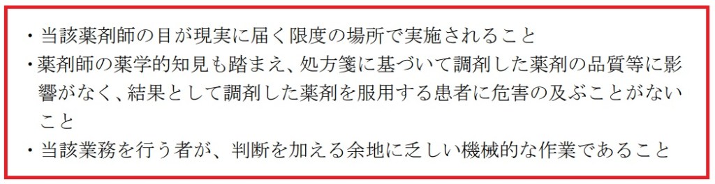 薬剤師の目が届く場所で、判断が必要ない機械的な作業で、品質に影響がなく、患者さんに危害の及ぶことのない行為…🤔