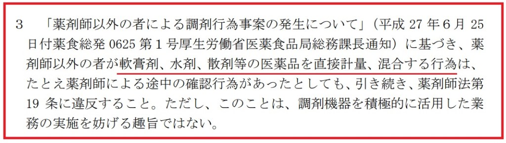 「薬剤師以外の者が軟膏剤、水剤、散剤等の医薬品を直接計量、混合する行為は違反」って分かりやすく書いてますので、これらの行為は非薬剤師が行ったらダメなんです!