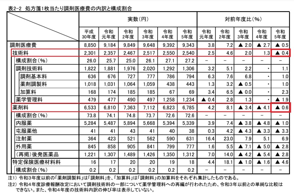 処方箋1枚当たりの技術料と薬剤料を見ると
