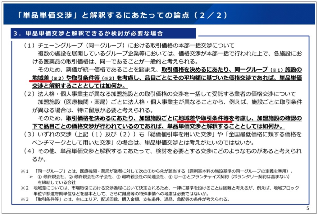 薬局の地域差や取引条件等を考慮して、品目ごとにその平均額に基づいた価格交渉をしているなら、単品単価交渉として解釈しましょう、となっています。