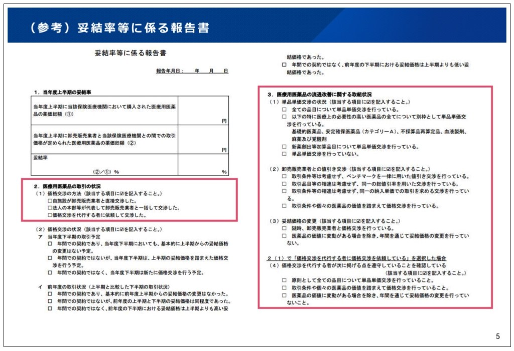 妥結率の報告書について「医療用医薬品の取引状況」と「医療用医薬品の流通改善に関する取組状況」に関する報告項目が追加されましたが