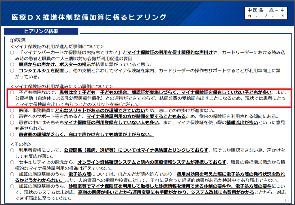 ヒヤリングの結果、小児の場合は、顔認証がしづらい事やマイナ保険証を保有していない事例が多いようで、特例的な対応となったようです。