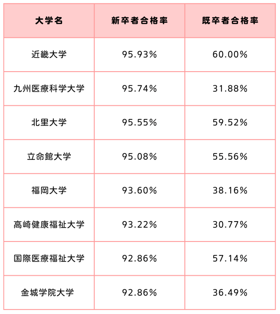 新卒者の合格率が9割を超えている大学で、既卒者の合格率が高い大学と低い大学があります。