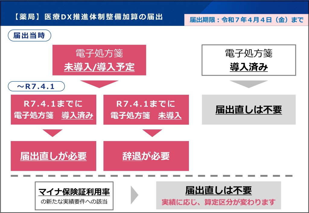 R7年4月1日から医療DX推進体制整備加算が見直されて、点数や要件が変更になり、届出が必要になる薬局もあります。