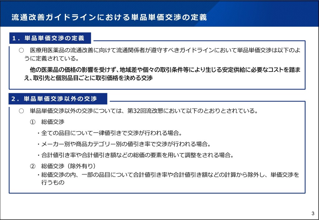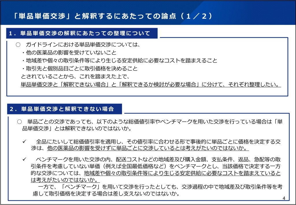 他の医薬品の価格の影響を受けず、地域差や個々の取引条件等により生じる安定供給に必要なコストを踏まえ、取引先と個別品目ごとに取引価格を決める交渉