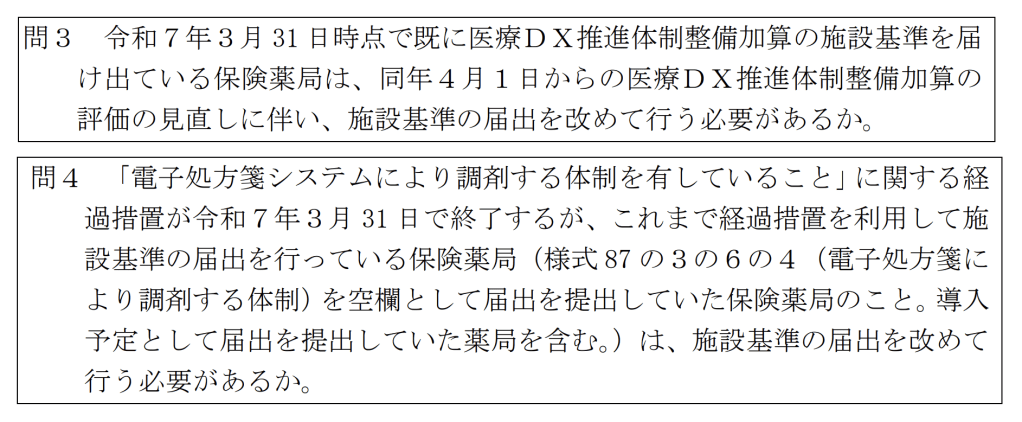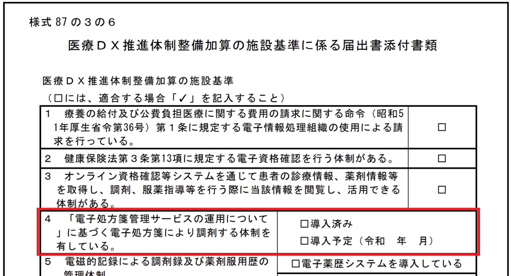 経過措置を利用していた(様式 87 の3の6の4を空白(導入予定)で提出している)薬局は、電子処方箋が調剤できる体制になり、引き続き医療DX加算を算定する場合は、届出が必要になります。