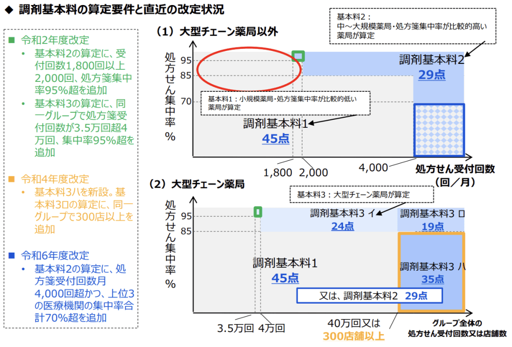 「処方箋集中率が高い薬局であっても、集中率が低く小規模な薬局と同様に調剤基本料1が算定されている。」
