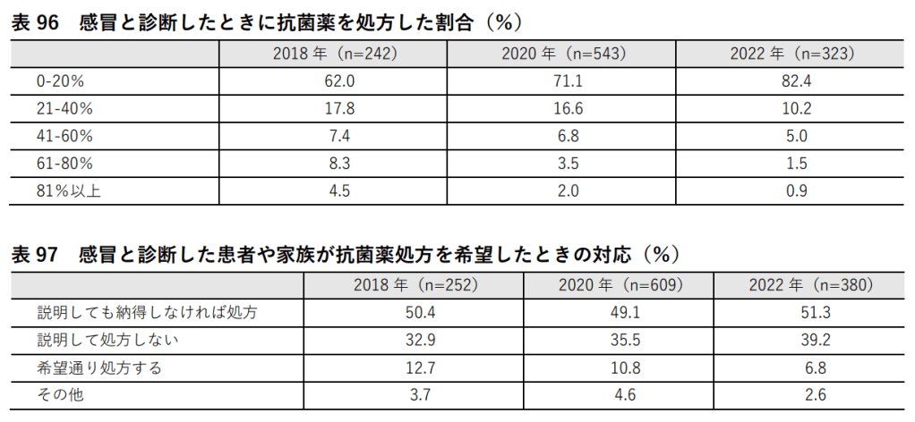 感冒への抗菌薬処方割合は「0-20%」との回答が 71.1%から 82.4%となり、処方割合が低くなっている傾向にあります。