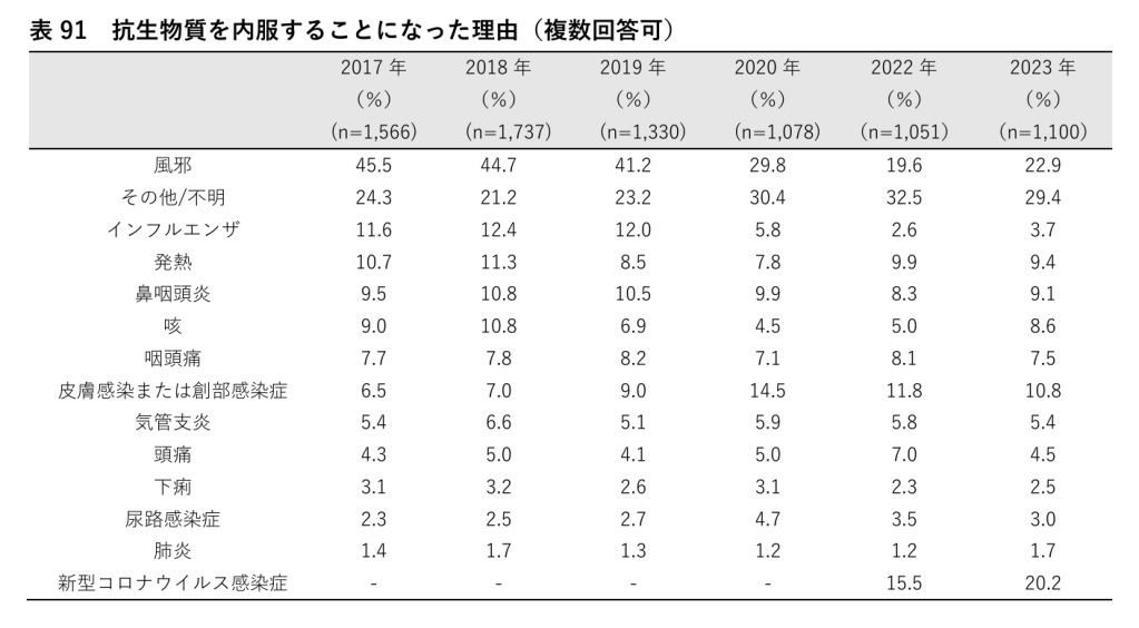 2019年までは回答者全体の40%以上がかぜを理由として抗菌薬を内服していましたが、2022年は19.6%に減少し、2023年は22.9%でした。