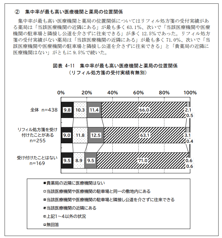 リフィル処方箋の受付有無について、どちらも近隣に医療機関がある薬局(▨)が多い結果になり、医療機関との距離はリフィル処方箋の受付有無にそこまで影響しないと思います。