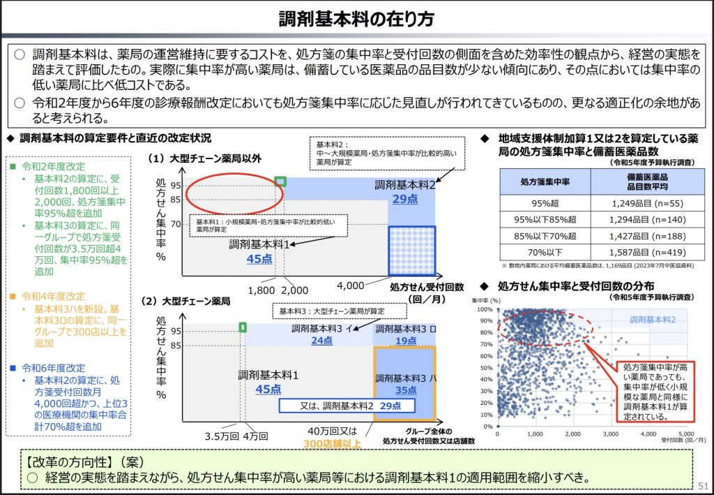 調剤基本料1については、処方箋集中率が高い薬局で適用対象となっている事例が多く、集中率が高い薬局を除外するように提言しています。