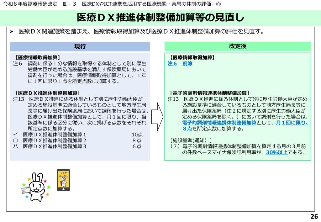 今回、名称が「電子的調剤情報連携体制整備加算」となり、求められる利用率は30%以上になります。