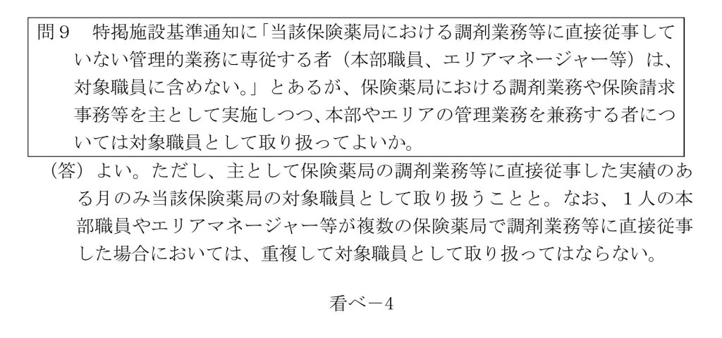 しかし、疑義解釈においては、調剤業務を行っている本部職員やエリアマネージャーは対象者になると回答が示されました。