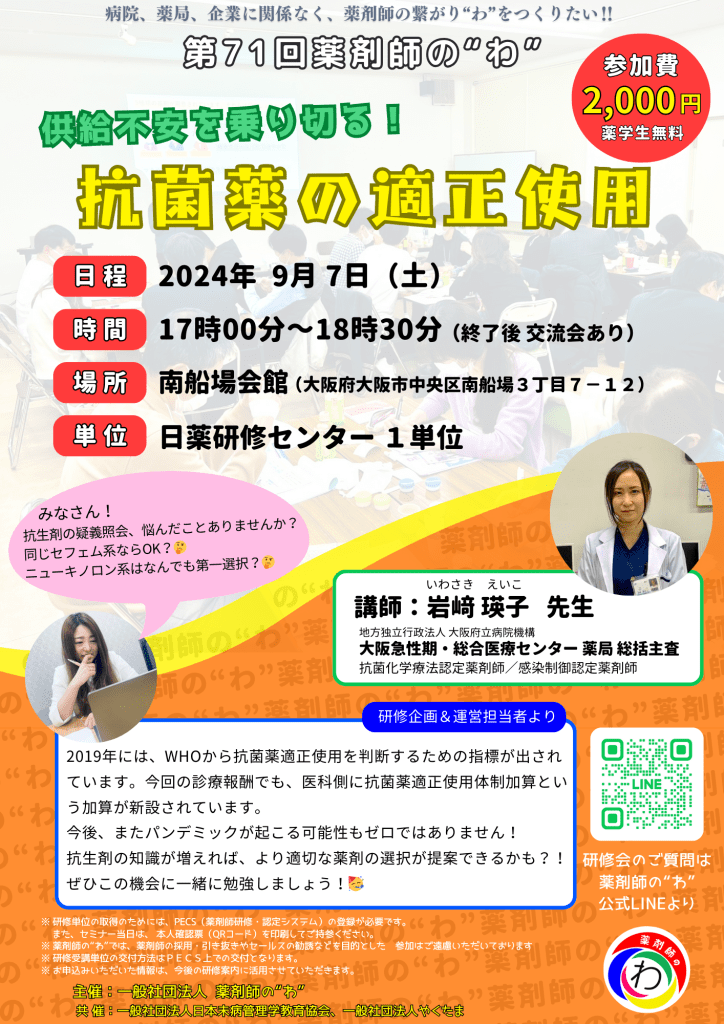 9月4日(土)17時より、第71回薬剤師の“わ”を開催します❗️